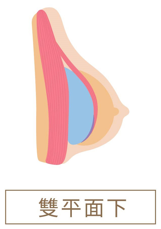 雙平面技術-是透過內視鏡將胸大肌的下緣精準分離,將胸部的皮膚和軟組織之間的張力釋放,打造出的空間,更能容納義乳假體,最後把胸大肌的肌肉覆蓋在假體的上半部,而下半部的假體被胸大肌的筋膜覆蓋,將義乳透過「雙平面」包覆著。 雙平面技術的好處:可減少隆乳後假體出現邊緣感,乳房下緣能呈現較飽滿、自然波動的水滴形狀,術後的恢復期較短,並能減少隆乳後莢膜攣縮的機會。